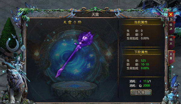 天雷生命加成,主打前期优先升级,消耗相应银币、狮眼石升级法杖,会提高生命、防御、生命加成属性,银币可通过回收装备获得,可通过免费会员礼包、开服活动、神殿商城获取。