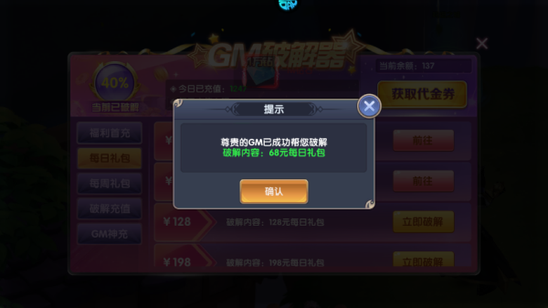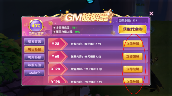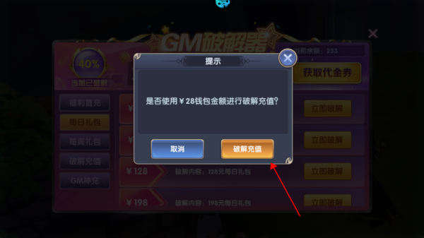 选择充值,点击立即破解(需使用余额,余额通过击杀boss获取)