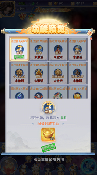 在功能预览里可以预览所有的玩法及开启条件,玩法开启越早越有优势。