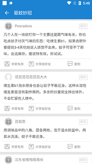 点击“驱蚊妙招”,这里有很多其他用户发表的驱蚊心得,可以复制分享给好友哦。