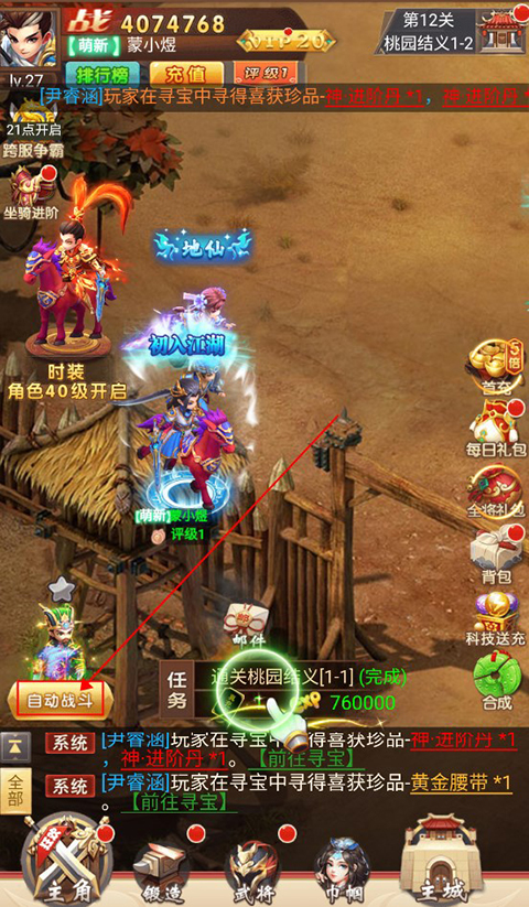 在玩家通过第一章关卡时,即可解锁自动战斗按钮,点击即可让人物自动战斗闯关。