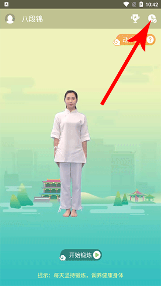打开健身八段锦app,点击开始锻炼,就可跟着真人视频一起学习。