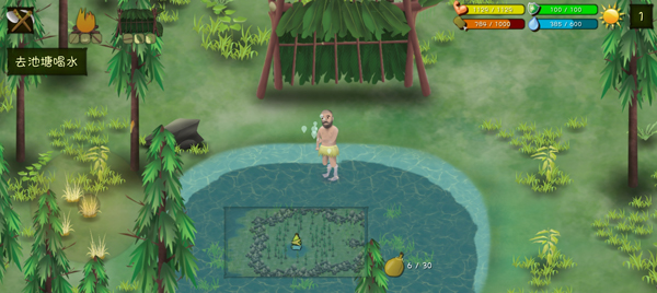 挑战菲律宾海岛(指游戏中的一个图)时感觉随着生存时间的增加,每天对水的消耗量也在增加。由于菲律宾海岛淡水匮乏,所以笔者又来到了泰国丛林(指游戏中的一个图)。