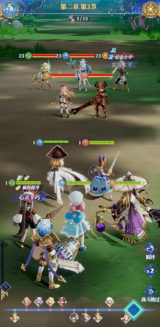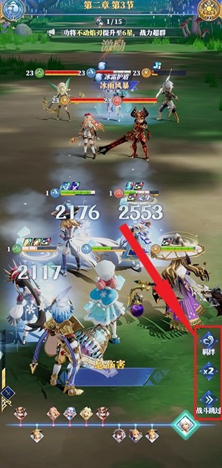 在战斗页面,可以点击右边的羁绊查看游戏人物的羁绊情况,也可以点击下方的x2加快战斗速度,当然,如果玩家对战斗非常有信心可以直接点击下方的跳过,直接快速结束战斗。