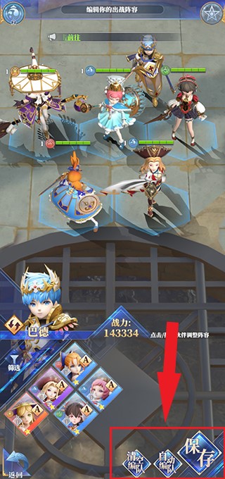 之后就可以调整阵容站位啦,玩家可以选择点击下方的自动编队让系统自动调整阵容,也可以手动移动上方人物调整阵容,调整完毕之后点击保存即可。