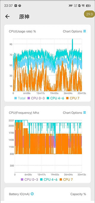 找到《原神》对应的任务,点击它就能看到丰富的监控信息了,包括MAX最大帧率、MIN最小帧率、AVG FPS平均帧率、VARIANCE帧速率差、≥45FPS流畅度、>46℃烫手警告、MAX最高温度和AVG平均温度,此外还更直观的帧率曲线,以及CPU占用率等曲线等。
