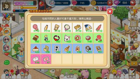 店员可以加好感,目前我不知道店员加好感除了有成就奖励以及可以穿不同的衣服外还有什么用……不同礼物对不同性格收益不同,最好能做到礼物有最大收益,两个紫色情书是固定的,分别是10点和50点,其他礼物对应性格收益正在统计ing,当然一般来说到了后期是不会差礼物的,比如我现在白色礼物每样100+绿色50+蓝色30+大情书十五本。