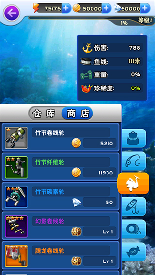 在这里我们可以选择更换我们的装备,用金币或者是钻石来购买更好的装备,能够大幅度提升我们钓鱼的成功率