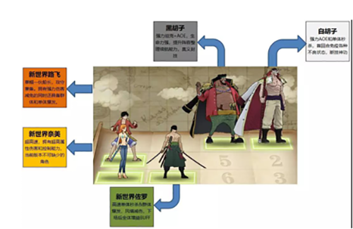 第二套阵容也是同样推荐给白胡子让出一个位置来让他当前排,这里推荐白胡子主要有两个原因:第一是关键性原因,白胡子有断技能力,虽然拿满怒的新世界奈美没办法,但是对于其他人还是起到关键性作用。新世界路飞上场后,拥有着可以媲美狮子歌歌的输出能力,正好新世界路飞的攻击方式为前排优先,索性把白胡子放到前排断新世界路飞的技能,让他放不出AOE,无法完成收割,这对战场的局势大有助益。第二个原因,白胡子震动之果天赋能让对方全体成员在两回合内命中和闪避降低,配合黑胡子,能够最大化降低对方的命中闪避,也同样具有战略作用。