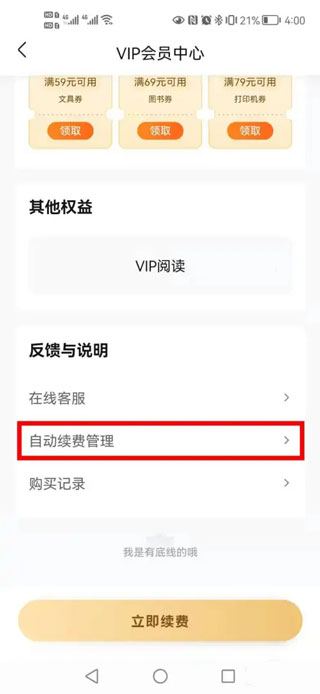 将【VIP会员中心】页面的拉到最下面,有个【反馈与说明】,点击下面的【自动续费管理】。