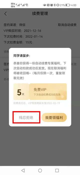 商家为了防止你取消自动续费,会发些吸引的优惠,不用管它,直接点击【残忍拒绝】就好了。如果下次再需要开通VIP功能,使用时再开就行了,开通后别忘记按以上步骤再把自动续费功能关闭掉。