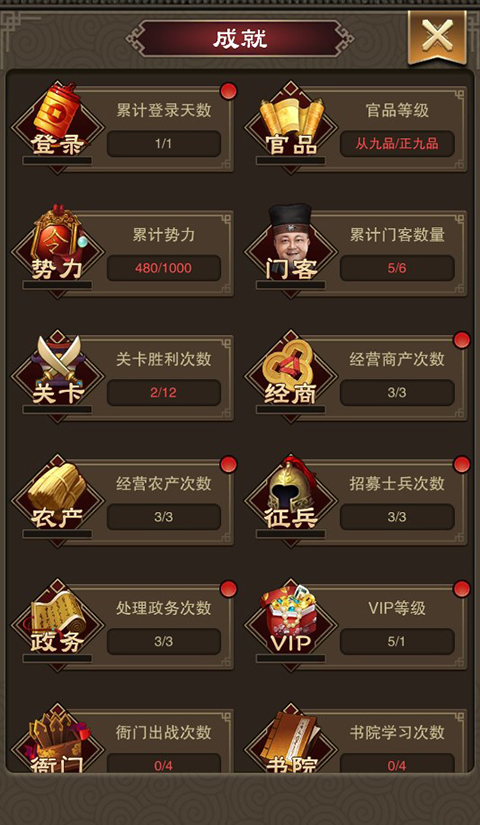 新手玩家容易达成的就是成就啦,因为登录也可以达成,玩家每达成一个成就都可以获得奖励,当玩家全部成就都完成时,便是升官发达之时。