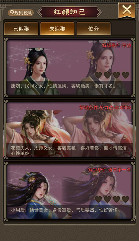游戏内的红颜即为后宫,每个红颜的位分都是不一样的,玩家在达到一定势力以及亲密度的时候可以对红颜进行位分。