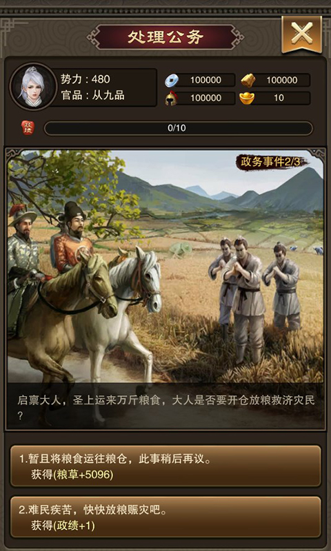 在游戏中会有各种各样的政务事件发送,需要玩家及时处理,处理成功后可以增加粮草和政绩。