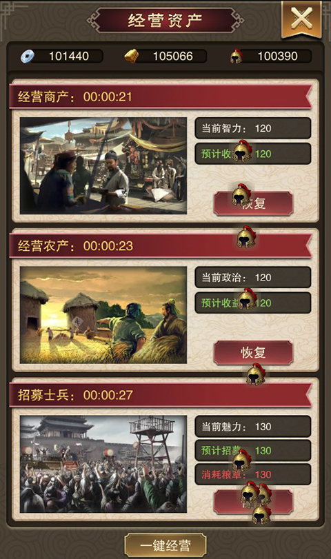 当然啦,游戏内的主要经济来源还是需要玩家进行资产的经营,游戏内有商产和农产可以经营,每隔一段时间都可以获得收益。