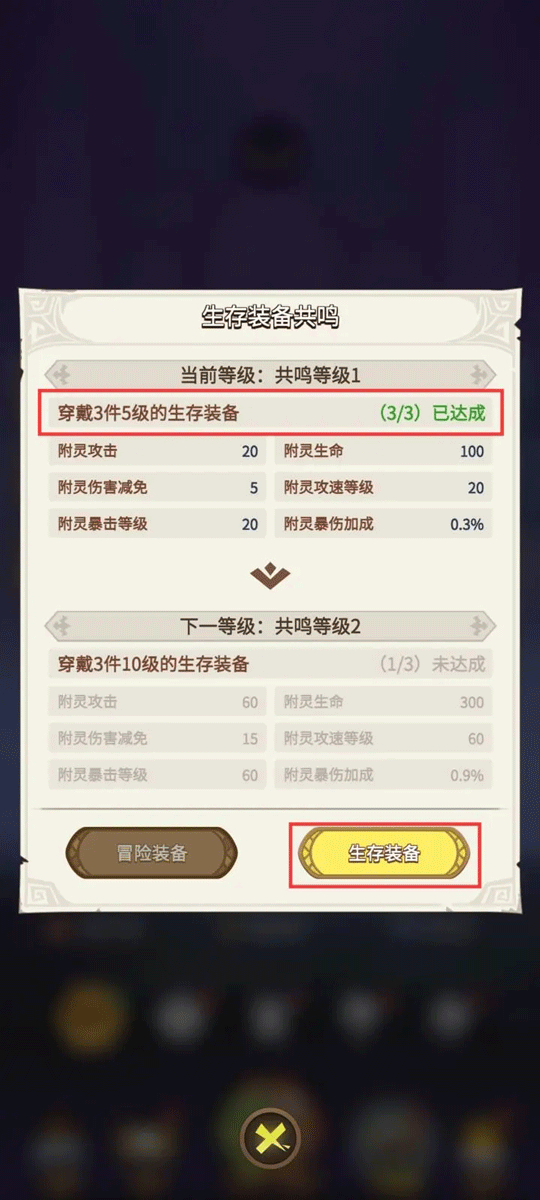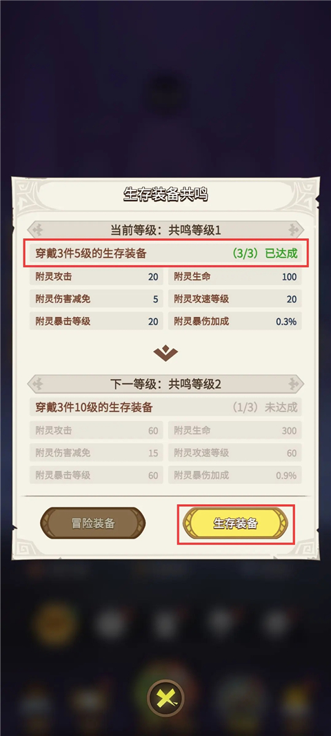 生存装备可提高玩家参与生存玩法时初始角色的属性,通过附灵、生存装备提高角色属性可以应对后续关卡更轻松。另外,生存装备还具有冒险词条,可在冒险模式中生效。
