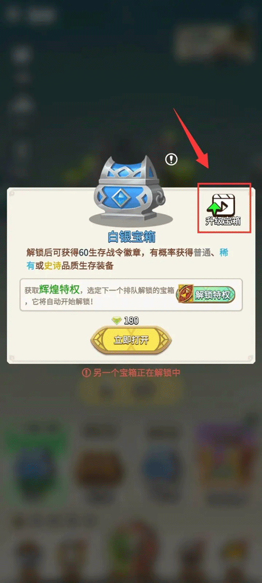 PS:宝箱品质越高,可获得的生存装备品质越高,可通过观看广告升级宝箱;关卡越往后,获得高品质宝箱的概率越高。