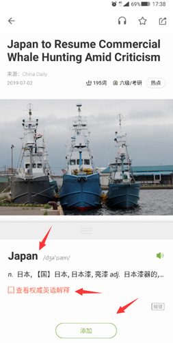打开文章后,会发现都是英文的。这时候只要看到不懂的单词,就可以点进去看看。