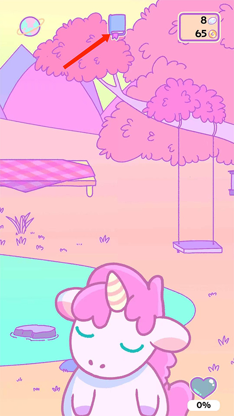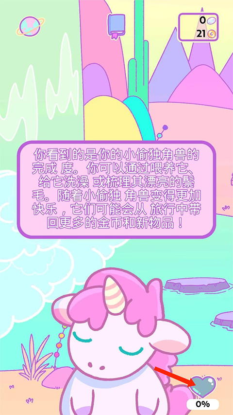 进入游戏主界面,右下角为独角兽的心情完成度,完成度越高带回来的金币和物品也会越丰富,点击独角兽,