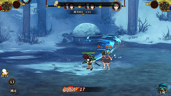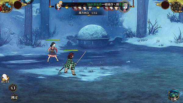 游戏战斗时属于挂机战斗,左下角可以加buff,还建议点击倍速。