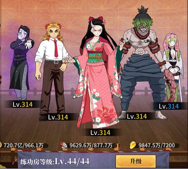 这套和第二套相比主要两个角色换了,一个是恋柱,一个是学院义勇,主要这两个算是平民能养的并且前期比较强势的输出了,不过考虑到后期的话,还是更建议搞蛇柱、风柱这几个。