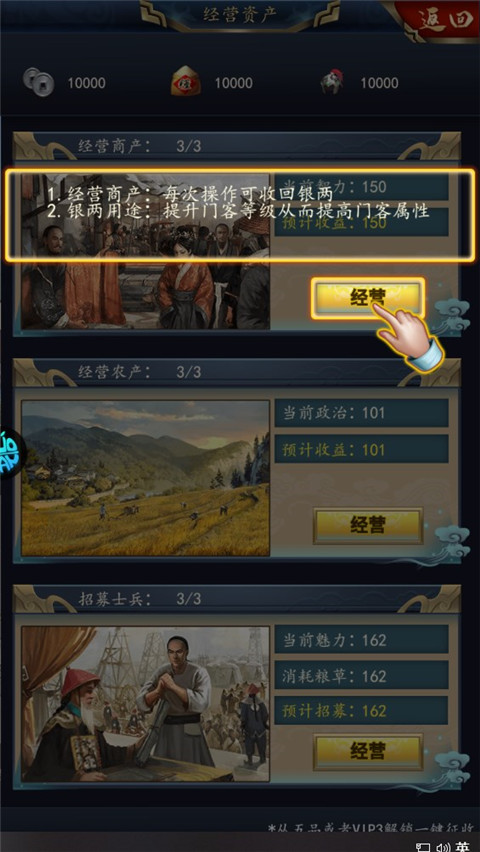 你需要管理王朝的各个方面,包括政治、经济、军事等。合理安排国家资源,提升国力,确保王朝的兴盛。