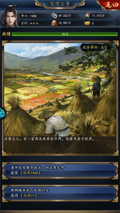 需要处理各种政务事务,如处理官员上书、调查官员贪污等。根据每个事件的不同,选择合适的解决方式,例如处罚、奖赏、重用等。