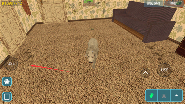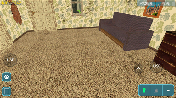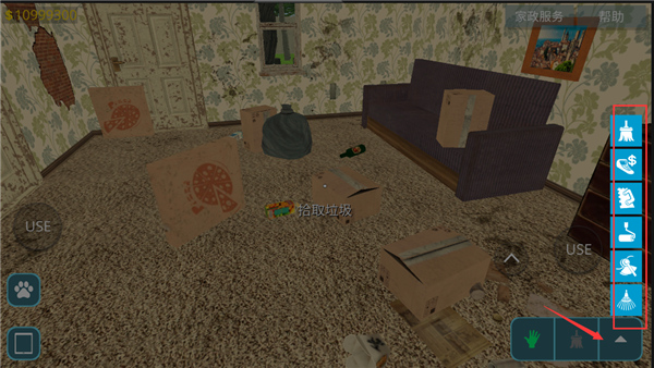 成功进入房间,点击右下角的这个图标可以使用道具来打扫垃圾;