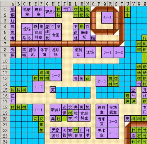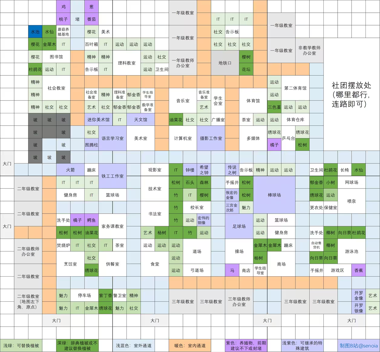 除更衣室、告示板以外,尽可能不使用重复的建筑,并保持全图联通,告示板可以提高活动质量,更衣室换衣服后才能使用教具;