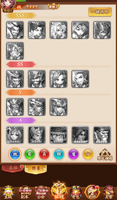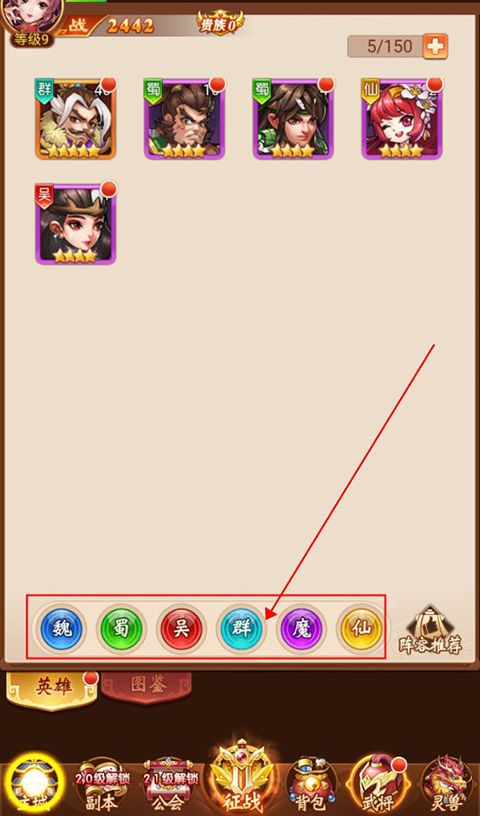 武将按阵营分为魏、蜀、吴、群、魔、仙、六个阵容。