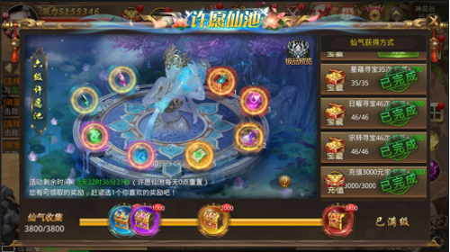 当仙气达到升级所需经验时,可手动升级许愿仙池,许愿仙池等级越高奖励越好;