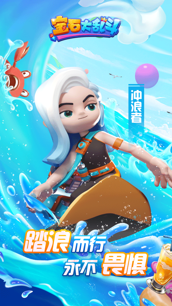 冲浪者踏浪而来,海浪随机带走30块宝石,随后海浪再次冲刷棋盘,带回27块宝石和3个海洋生物。