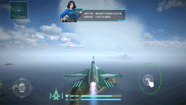 之后可以根据指引操作机器,左下方的圆圈是方向控制摇杆,可以先往左滑动。控制飞机向左飞行一段距离。