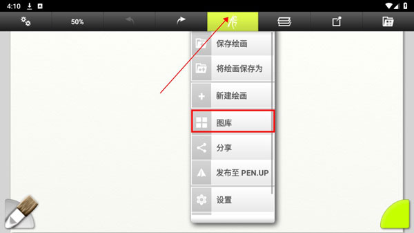 打开主菜单,点击菜单栏上的Artrage标志,然后点击菜单中的"图库"。