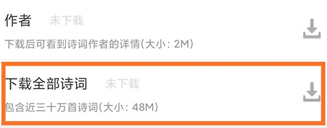 进入功能包页面,在里面找到下载全部诗词,点击右边的下载按钮即可完成下载。软件不支持单首诗词的下载。