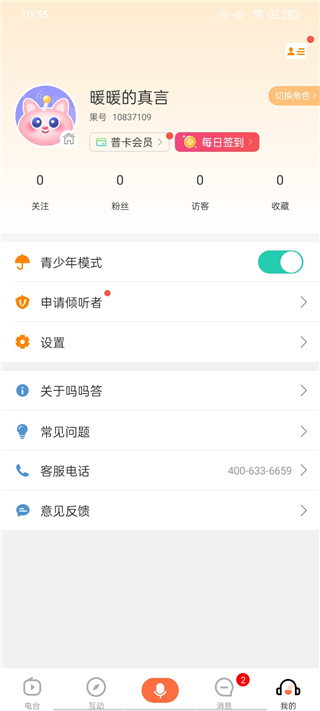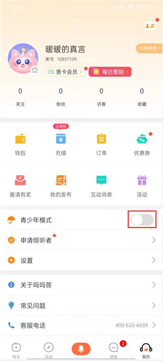 打开软件后会自动给与一个账号,点击下方菜单栏“我的”,打开上方青少年模式。