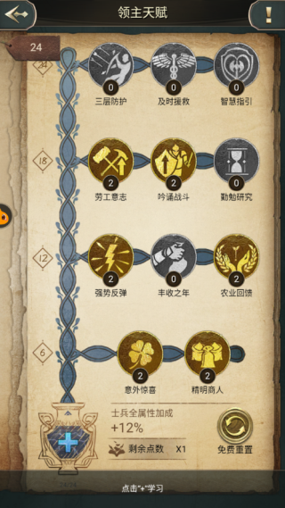 下面是我达到城堡28级/领主84级后常用的种田天赋。该天赋的重点是训练、建造与采集。