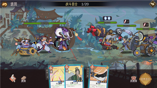 卡牌大致分为两种,一种是对己方使用的增益卡牌,一种是对敌方使用的攻击卡牌。每次使用都会消耗行动力,行动力不足时则无法使用卡牌。