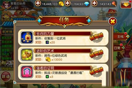 任务引导着我们的武将,从无名小卒一步步走向强大的道路。完成不同的任务可获得不同的任务奖励,奖励中有丰厚的钻石,金币,及稀有道具!