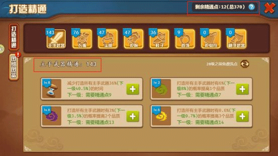 进入神兵图鉴--打造精通,可在右上角查看目前剩余的精通点,精通点可以对某一类装备进行过精通加点,经过加点后的装备可以获得提高品质、减少打造时间等作用。此外,页面中也会显示当前装备的精通点。