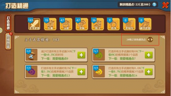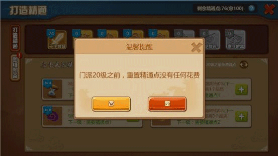 20级及以前则有3次的免费重置次数。之后再重置,就会根据已使用的精通点数,等值的花费银元宝重置精通点。