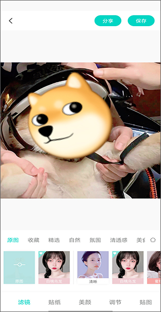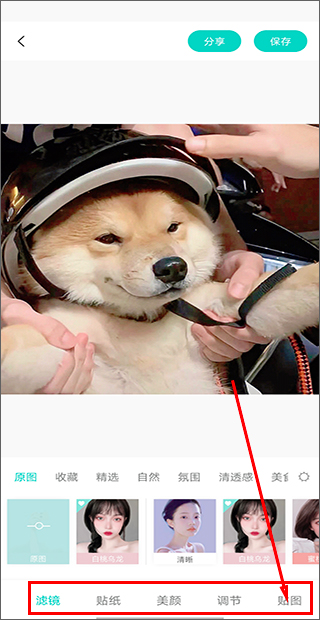 随后我们可以对照片进行编辑,添加滤镜、贴纸,进行美颜等操作,点击下方的“贴图”进入;