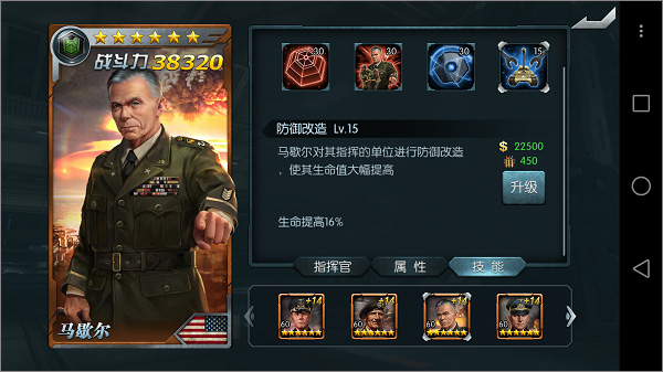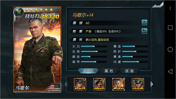 马歇尔指挥的单位,使全体单位拥有超强的对中型坦克的抵御能力,大幅降低受到的中型伤害。中型坦克的克星,可以非常有效的降低被中型坦克攻击时受到伤害。