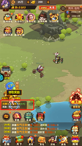 游戏开局没什么好说的跟着流程走升级就行,一直推图,冲等级,打不过就升级武将,升级装备等级,不要省着不敢升级,武将经验和钱都是可以用元宝返还的,只要1元宝,15级时会开通征收记得点,这个回复很快的,每次升级会自动 就增加5次增收,一不注意会满了造成浪费,第一天的一切资源都为了经验服务,这个也关系到第二天的等级排名,冲级时需要的武将和装备方面我会在后面2个装备篇和武将篇说明,再实在推不了图的时候可以选择扫荡获得经验,留意好自己的等级,在30级之后,每提升10级都能获得较大的战力提升,一般都能提升50-200W左右的战力,记得提升好战力后多推图再扫荡,争取经验效益最大化。