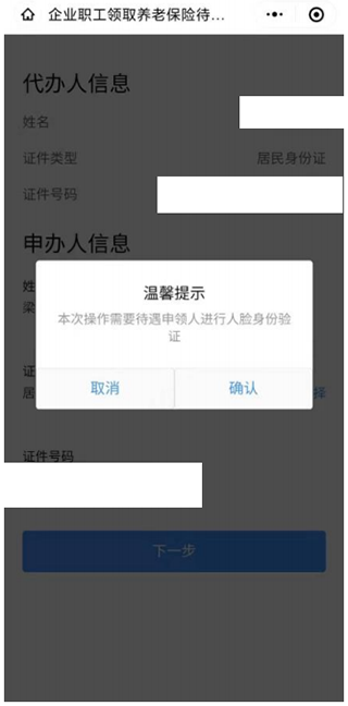 进入申办人信息页面。办理方式为“本人办理”时,核对申办人信息,点击【下一步】按钮;办理方式为“为他人办理”时,核对代办人信息,在申办人信息模块录入需要办理企业职工领取养老保险待遇资格认证人员的姓名、证件类型、证件号码,核对无误后点击【下一步】按钮;