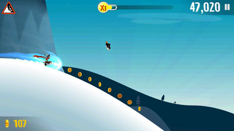 游戏屏幕上方会有此时的奖励状态,玩家通过在滑行中收集金币奖励、完成高难度动作等,可以填满奖励状态,从而激活各种高级工具例如火箭船等,还可以和企鹅、雪怪人一同搭载着火箭船奔向远方。
