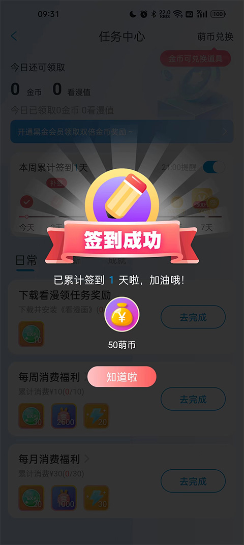 之后会来到任务中心页面,完成下列相应的任务可以获得萌币奖励。