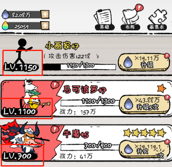 大多数的英雄保持在701级这个级别就好,只有小画家以及你要培养的主C位,比如说这里的马可波罗等级可以升上去,尽量不要在其他英雄身上浪费太多经验和物资。如果整个队伍的平均等级很高,那么整体的战力其实是有点虚高的,这样玩的效果并不如直接将资源集中到1-2个角色上。