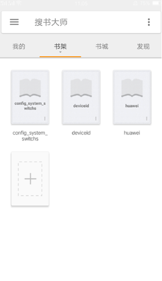 首先在手机上打开搜书大师,在书架界面点击“+”号图标;