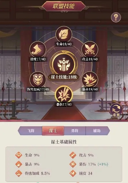 飞将、勇将、谋士、辅助四个职业对应各自的联盟技能,每一类只对相应的职业加成。消耗铜钱和青龙玉可以提高对应职业的基础属性。